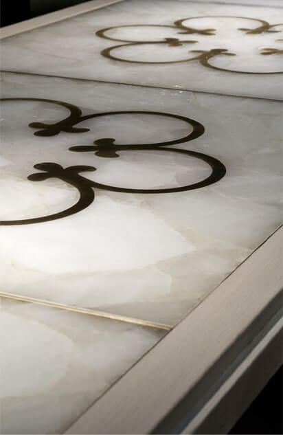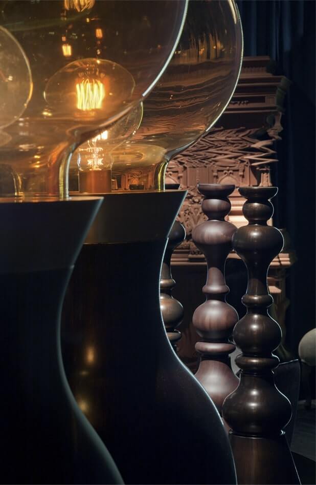The walls envelop the environment in a dark grey with a bluish tint, enlivened by the addition of greyish blue curtains that drape the walls, conferring to the room a sense of warmth and a diffuse charm. The parquet, in dark wood with grey graining, is warmed by the soft colours of fine carpets that make it even more welcoming and comfortable. The display is divided into two spaces by a backlit openwork panel that outlines floral and geometric motifs which confer a solemn, luminous visual effect to the room. The light grey beams which punctuate the perimeter are structural and decorative, reinforcing the sensation of being in a northern European dwelling, a whimsical manor in Oxfordshire or a sumptuous chalet in Normandy. The extreme care and the exquisite colours, finishes and materials recreate a refined, out of the ordinary living style which proposes different compositions collected into a journey inside an eccentric living room: the perfect frame for the Blend Collection pieces. Not only was the set - up created by the architects but also the products illustrated here were designed by Archer Humphryes for the collection - named 4 Quatrefoils.