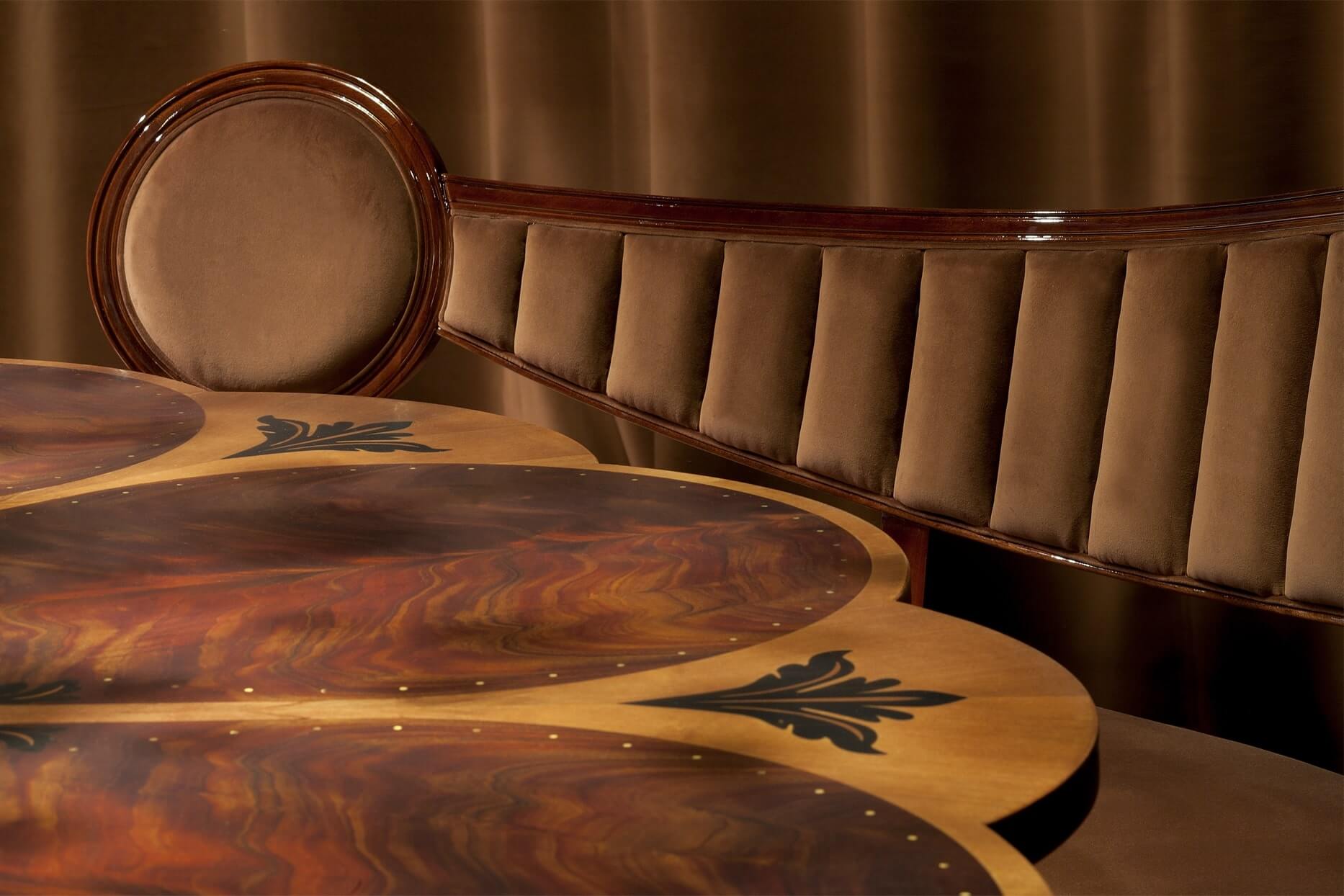 Pieces in white oak marry perfectly with dark woods like canaletto walnut and ziricote, just as soft nubuck leathers mix with coverings in intricate fabrics and elegant jacquards. The inlaid details in white quartzite, brass and ebony complete the rich mosaic of finishes that characterize the Blend Collection.