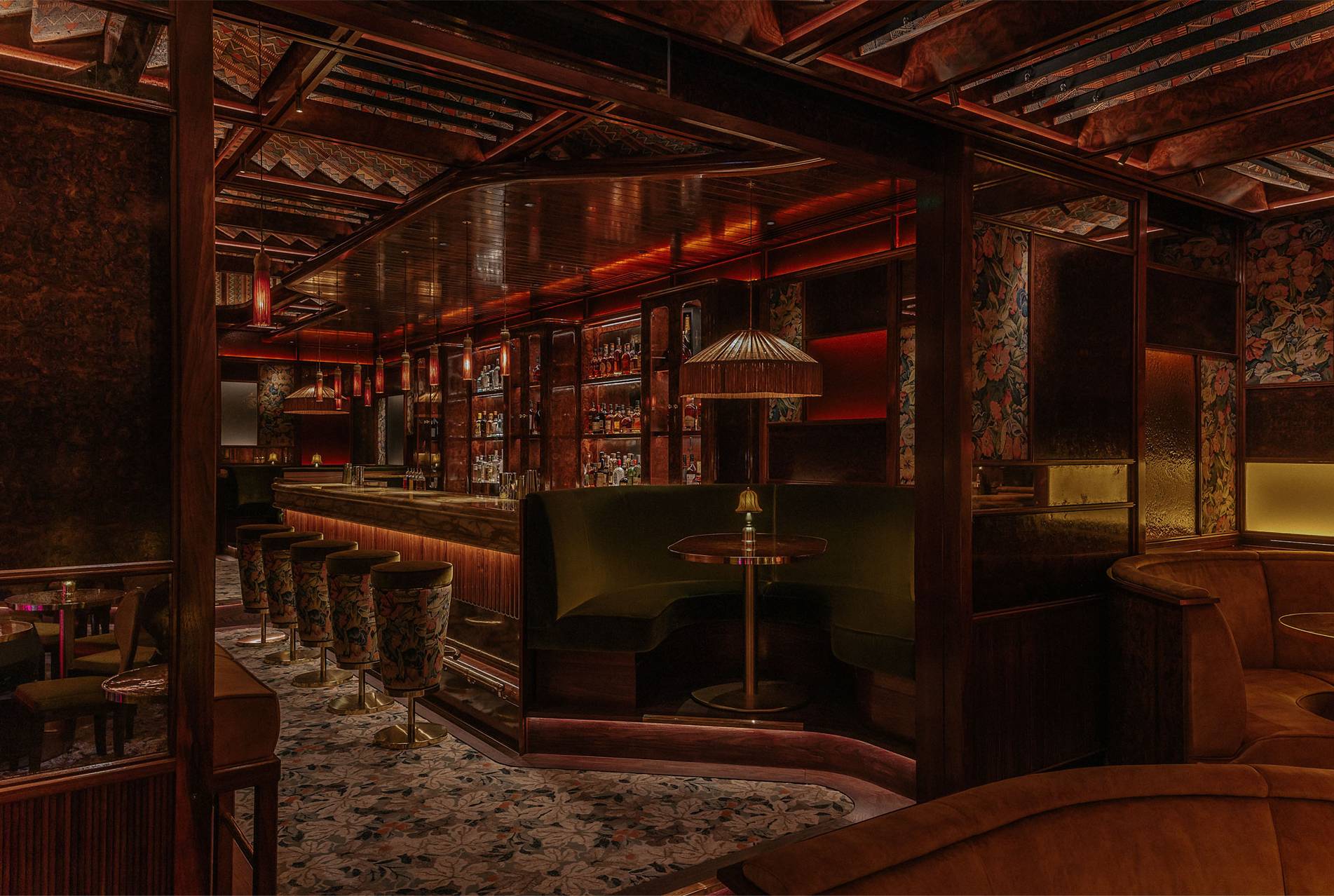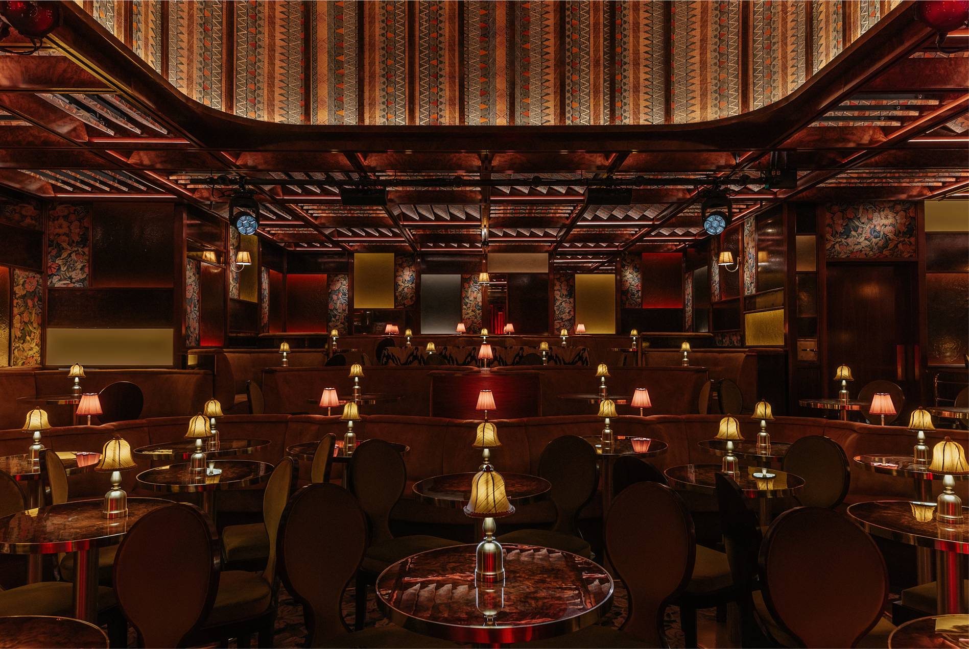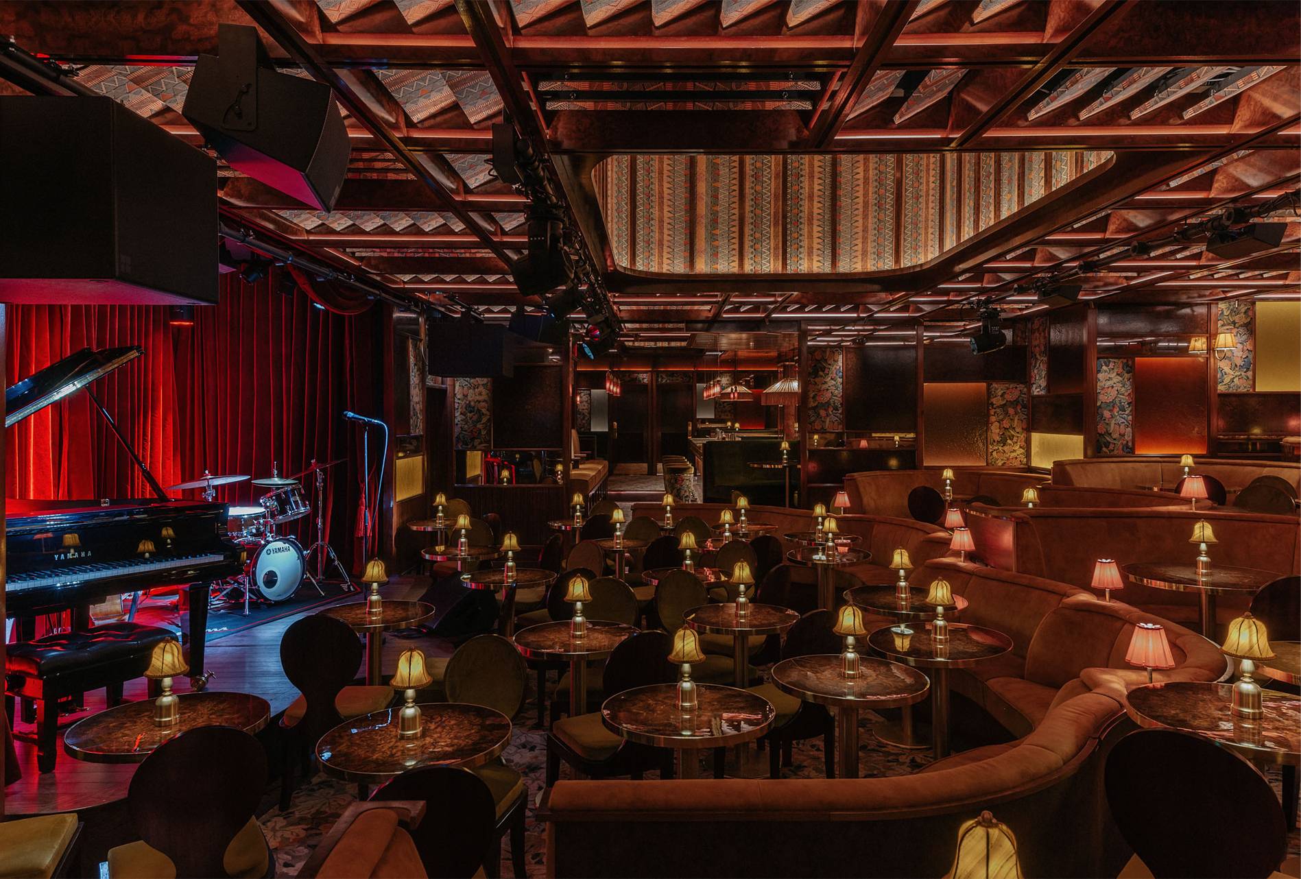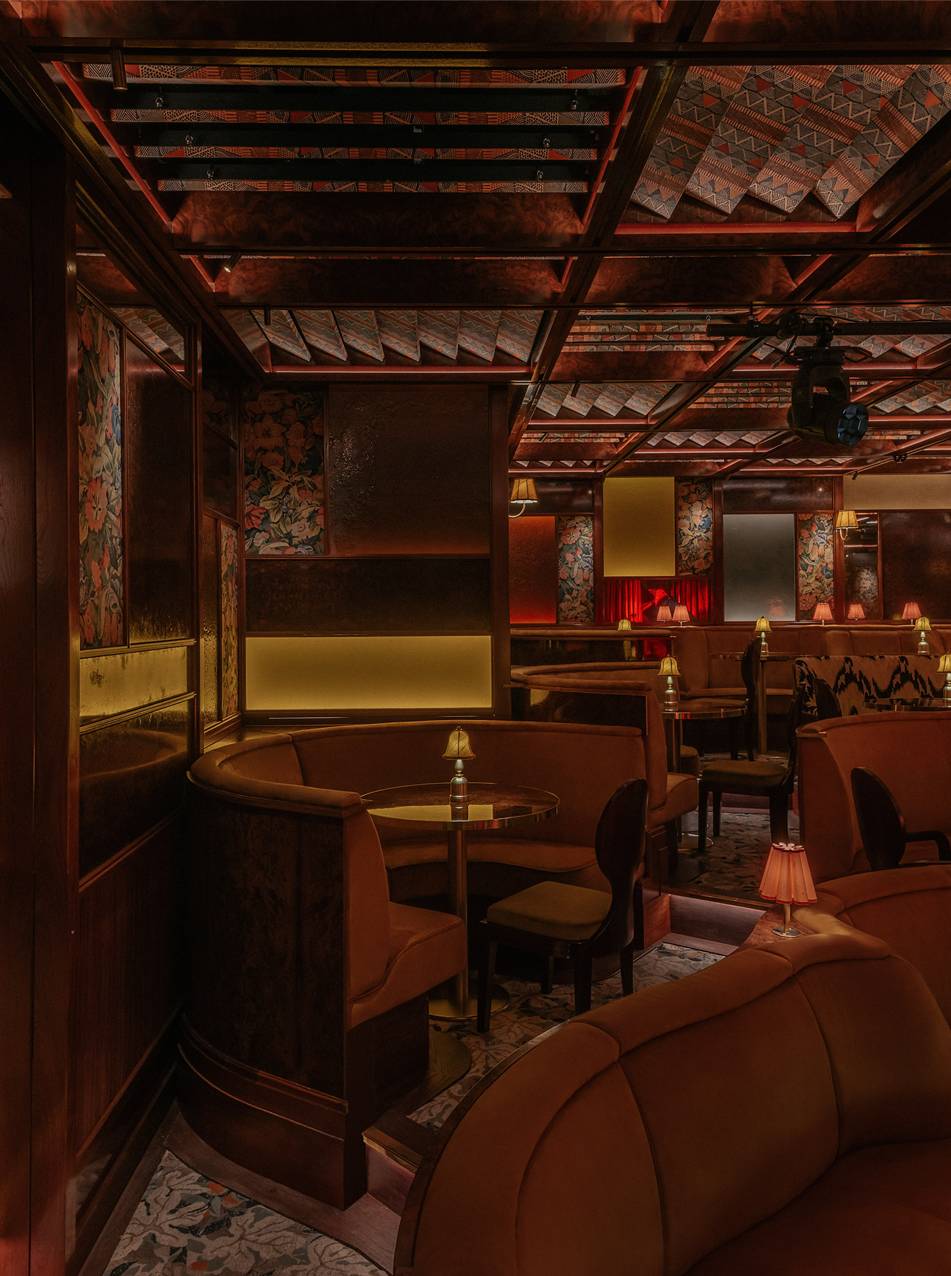 The design ethos for Upstairs at Ronnie’s balances glamour and intimacy, blending classic jazz-club sensibilities with contemporary luxury. Anchored by plush golden-velvet banquettes, elegant tassel lamps, and antique mirrors that catch the glow of soft lighting, the space feels both timeless and inviting. A standout feature is the dramatic domed ceiling, lined with striking Zimbabwean fabric, adding texture, pattern, and a rich sense of global craft to the interior. Overhead panels allow natural light to filter in by day, while at night the venue becomes moodier and performance-focused. A purpose-built auditorium with tiered seating and acoustics tailored for live music ensures every guest enjoys exceptional sightlines and sound, centred around a stage equipped with a Yamaha grand piano and state-of-the-art lighting.