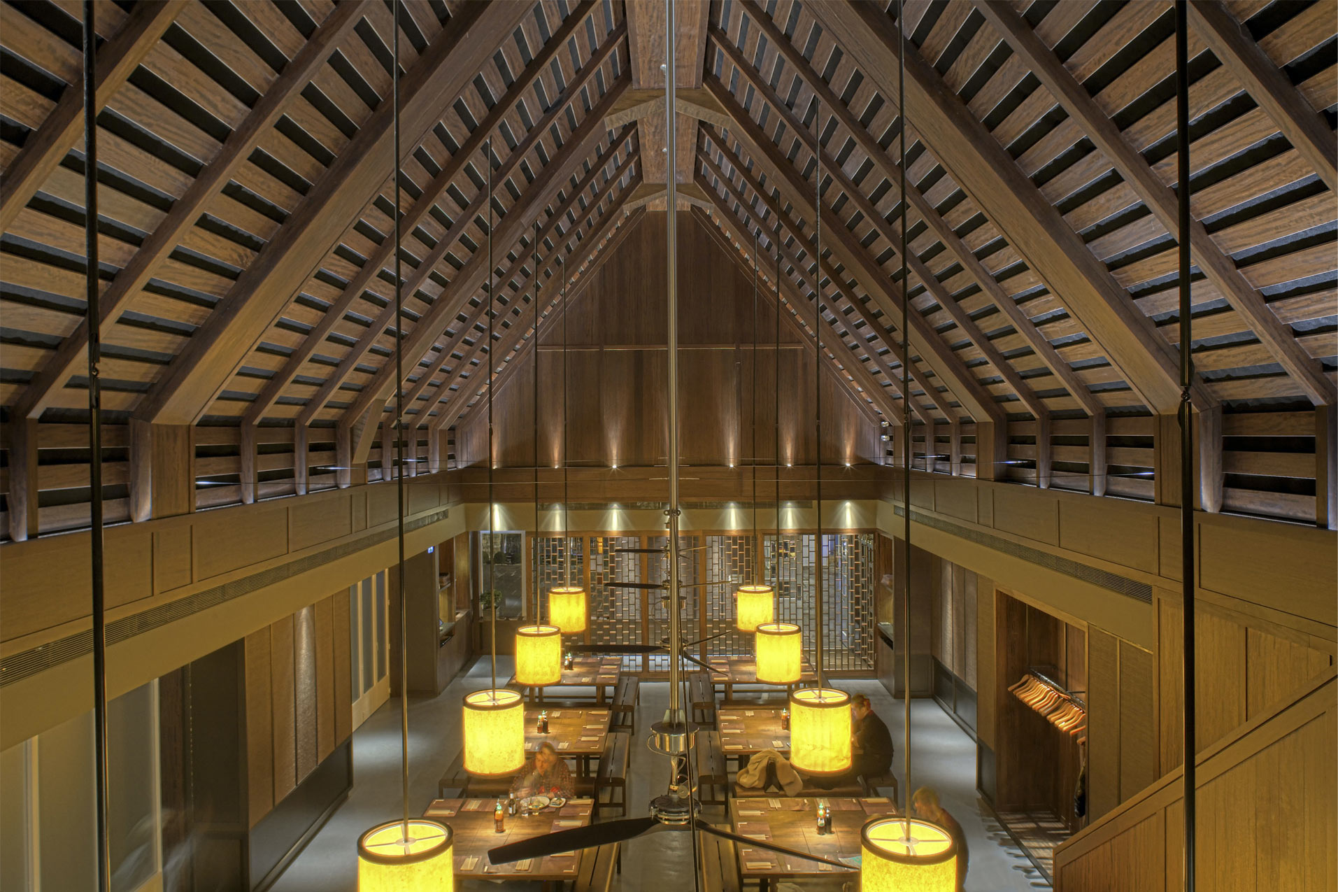 However, the character of the unit benefits from the lining of the double height volume with dark wood and deep beams, the lanterns and fans are hung from high level and agree with the layout of the teak communal dining tables. The entrance is separated by a Thai screen through which the dining hall, dramatic staircase and public balcony can all be viewed while waiting to be seated. The external areas are also developed further. The terrace dining area is surrounded with a pool containing lilies and planted with Frangipani trees, in addition to being supplied with a retractable fabric canopy and heating for diners on chilly evenings.