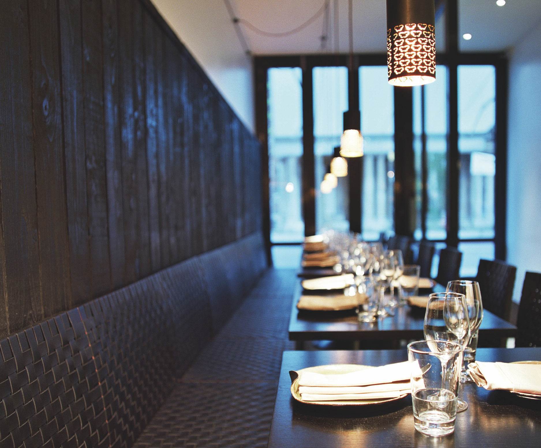 Beginning as neighbourhood eatery, a welcome antidote to the exploding market of chain restaurants on Islington’s popular Upper Street. The restaurant occupies a restricted linear site, which required ingenuity on the part of the architects to achieve a functional and inviting dining interior. Described by Time Out as possessing a “slinky, contemporary decor, with dark wood and oversized lampshades, [which] gives Isarn a polished, expensive image.” By controlling the perspective, the architects made a virtue of the long narrow site (four metres wide by 23 metres long). Linking four areas—the street elevation, the bar, the conservatory and the courtyard—a simple solution that provides an atmospheric and vivacious space, with a canopied roof giving a sense of heightened volume, despite its diminutive actual size.